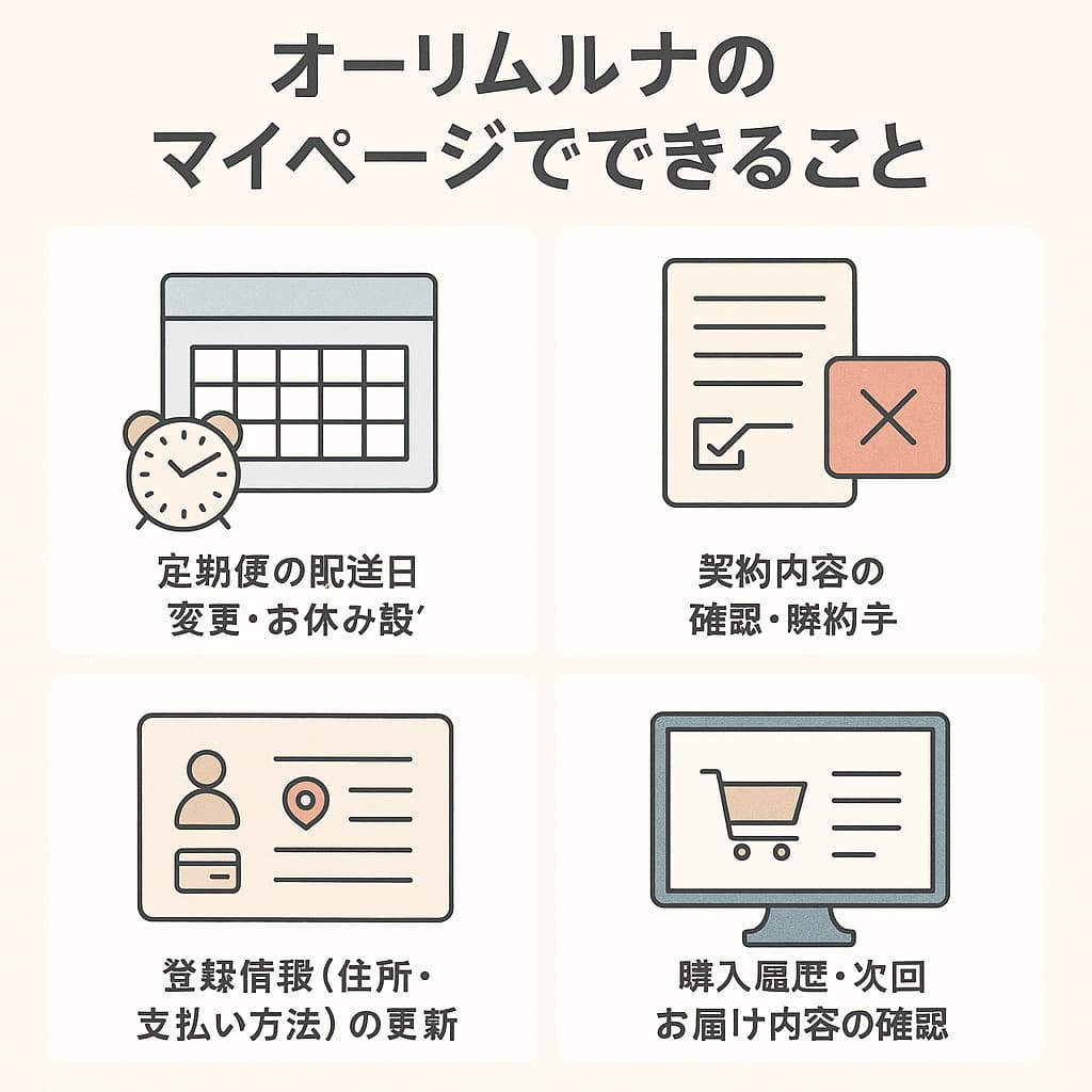 オーリムルナのマイページは、定期便の管理や登録情報の確認・変更など、多くの操作を自分で行える便利な機能が揃っています。
